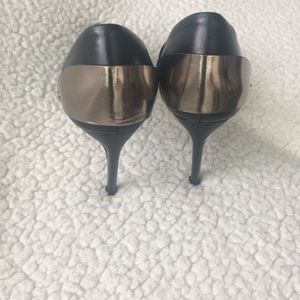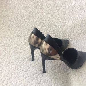 These ultra cool black leather d’orsay pumps feature steel plates over the heels. The 90mm heel height is very walkable. Fits like a slightly large 7.5, or a tight 8. Comes with extra heel taps.