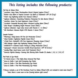 This lot consists of 22 skincare & beauty/ makeup products—a selection of full size items, travel size, deluxe minis, and sample packets