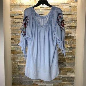This off-the-shoulder 3/4 length sleeve blouse features floral embroidery on the sleeves for a delicate touch.