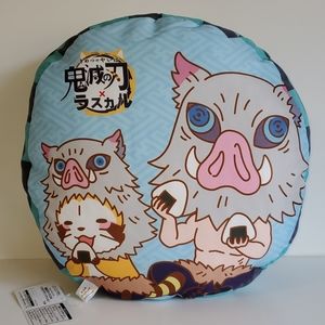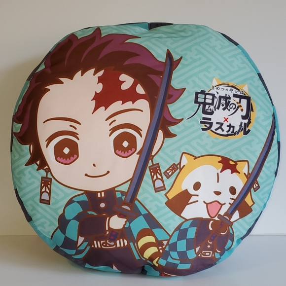 Demon Slayers (Kimetsu no Yaiba) x Rascal the Raccoon collaboration round cushion from Japan. From the popular anime. Tanjiro on one side and Inosuke on the reverse side. Officially licensed, new with tags, sealed in packaging. Size is approximately 36 cm in diameter.
