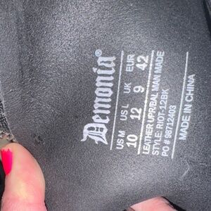 Here is a pair of size 10 Demonia Riot Boots. They are in great condition. Zippers work great. I’ve only worn them twice.