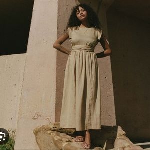 In crisp ramie, our beloved Pacifica Dress—which we first designed in Spring 2021—is a unique wrap silhouette with a square neckline, structured shoulders, and a full, ankle-grazing skirt. . buttons and self-ties allow you to adjust the fit, while waist ties can be wrapped and cinched at the front or back. Side slits allow you to show a little leg.
