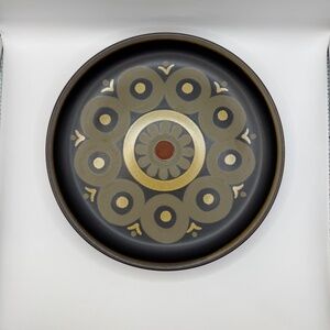 Originally Arabesque was titled Samarkand and started as a small set of giftware pieces designed by Gill Pemberton after a trip to Russia with her husband in 1962. That trip inspired the idea for the ochre red and golden hand painted floral decoration on a semi-matte deep brown glaze which she then developed further as it gained popularity. The design for Arabesque was bound to become a cultural icon of the 1960’s and 1970’s and continued in production for almost 20 years.