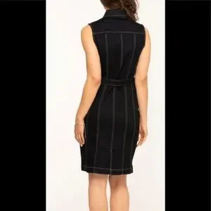 This sleeveless denim dress is styled for warmer days, with a unique button front and collared neck. Features strategic contrast stitching for a slimming effect and waist-defining belt.