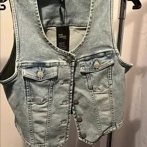 Stylish denim vest with button closure and chest pockets. Perfect for layering.