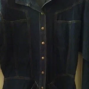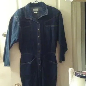 Stylish denim button-up dress with long sleeves. Features a classic collar and four front pockets.