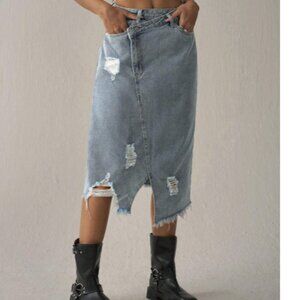 Denim Distressed Midi Skirt Western Cowgirl Boho Asymmetrical Raw Hem SHEIN Curve ~ Size 0XL = 12 (on SHEIN's website) ~ 90% Cotton, 6% Polyester, 4% Viscose