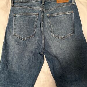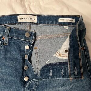 Classic blue high rise jeans from Denim Forum. Features button fly and slight distressing. High rise slim fit, size 27.