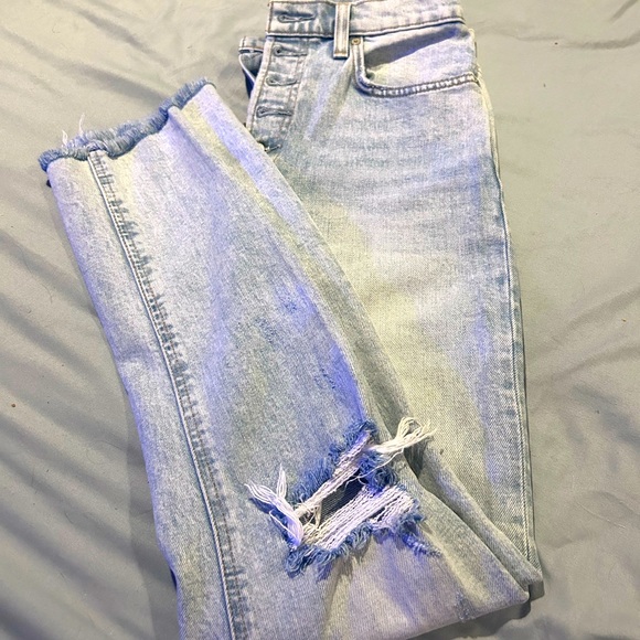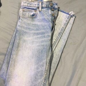 These light-wash distressed jeans feature a high-rise slim fit with a stylish ripped detail on both legs. Crafted from premium-quality organic Italian denim, they’re both trendy and comfortable. Perfect for casual wear, these jeans combine a modern silhouette with classic appeal. In great condition. Made by Aritzia size 27