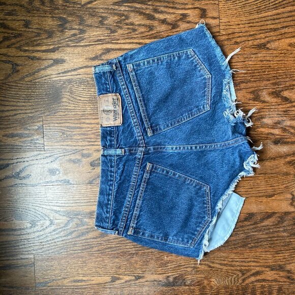 Stylish denim shorts with a frayed hem for a casual look. Perfect for summer outings.