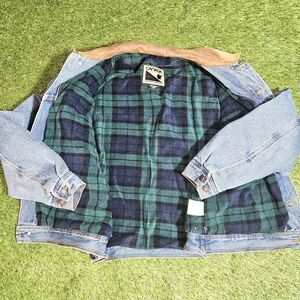 Stylish denim jean jacket featuring a contrasting tan collar. Perfect for casual outings. vintage great condition. very heavy, warm, high quality.