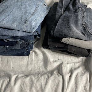 Light and dark blue, black and charcoal, demon and denim-like material, most are from jeans some are from leggings