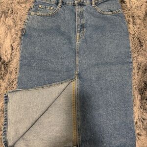 Skirt with a high waist and 5 pockets. Wash effect. Front zip and metal button closure.