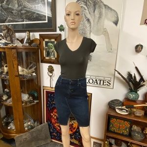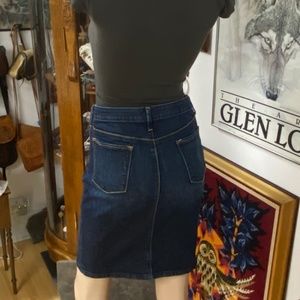 Classic denim skirt with front split, A-line cut in the gap of the split. Just above the knee length. Stretchy denim fabric in dark blue wash with super subtle fade. New condition (I only wore it once). The tag is marked with size 4, but it is a miss-sizing. This skirt fits medium on the larger end like a size 9 or 30. David Bitton Buffalo brand name. Casual, sexy, sophisticated look, many styles can be pulled off with this skirt.