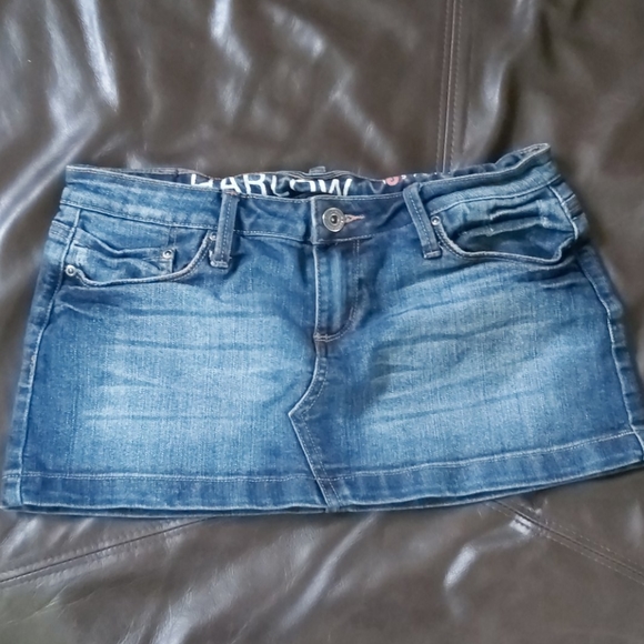 It's a classic denim mini skirt, but it's much too short for me. The pockets don't have any detailing, but the front and back seams have a sharp angle to them.