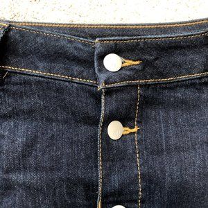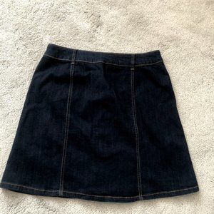 Size 06 dark wash denim mini skirt. It has a button closure and buttons down the entire front of the skirt. It's got some stretch to it so it's super comfy. Excellent condition, only worn a few times. It's a size 06, has belt loops, no pockets.