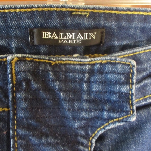 NWOT MINT CONDITION UNISEX BALMAIN PARIS MOTO SLIGHT STRETCH UNISEX SIZE 30 JEANS SLIM FIT CUT RIBBED/RIDGED MEDIUM BLUE, DISTRESSED. WAIST 30”, HIPS 36”, THIGH 18”, INSEAM 28”, PANT LEG HEM AT ZIPPER 11”, 8”RISE, CALVES 13.75”. I'VE HAD THEM IN STORAGE FOR YEARS. (TRIED THEM ON ONCE, LOVE THEM BUT UNFORTUNATELY THEY NEVER FIT ME) PLEASE CHECK YOUR MEASUREMENTS BEFORE PURCHASING. THESE USUALLY SELL FOR BETWEEN $750-$1500 ONLY REASONABLE OFFERS WILL BE ACCEPTED