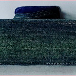 Pre-owned but unused. Lining is blue polyester, flap over magnetic closure.