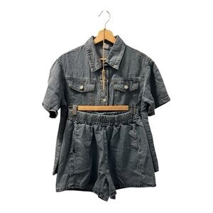 Casual denim shirt and shorts set. Includes a stylish straw hat. Perfect for a relaxed day out.