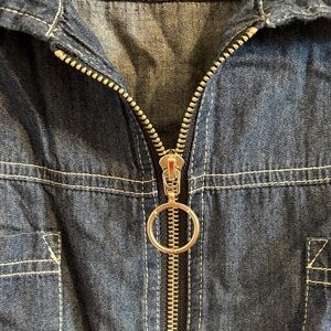 Stylish denim sleeveless dress featuring a front zipper. Perfect for casual outings.