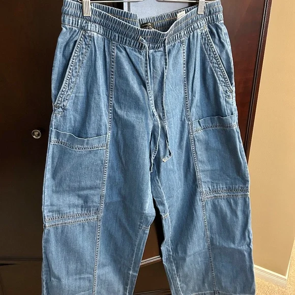 Relaxed fit denim pants with a comfortable elastic waistband ad adjustable drawstring. Features utility style seam detailing and patch pockets for an easy, laid back look that's perfect for casual days.
