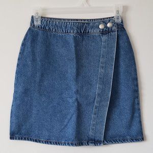 ASOS DESIGN denim wrap skirt in stonewash blue.