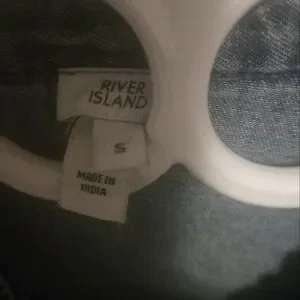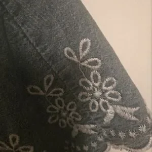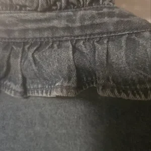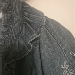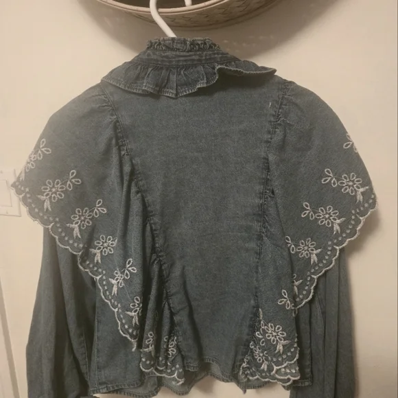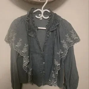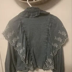 beautiful vintage denim blouse with ruffle buttons and puff sleeves. Wear open and layer or on its own . Eyelet detail on ruffle .