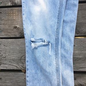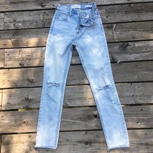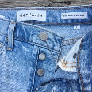 Denim Forum the Yoko high rise slim, light wash, exposed button fly and distressed with raw hem. Small mark on back off left leg see photo very faint