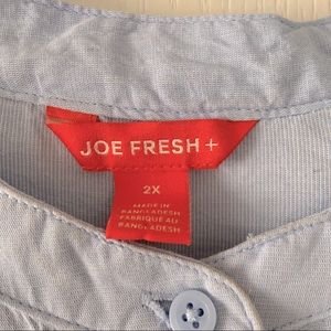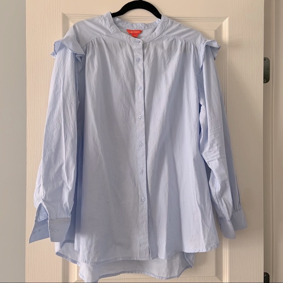 Joe Fresh long sleeve denim blouse with a ruffle on the sleeve. Super light and loose with a full button up front. Falls mid bum and has room for a larger bust when buttoned