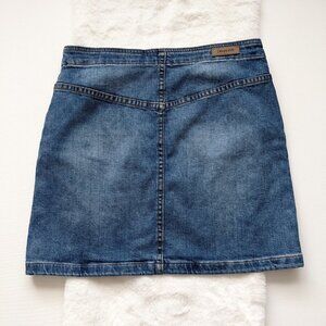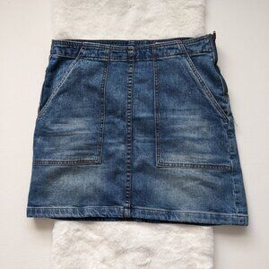 High Waist fit, size zipper with button fastening. Two side pockets at front. Fade wash. Cotton, 2% spandex. 15" waist, 15" length.