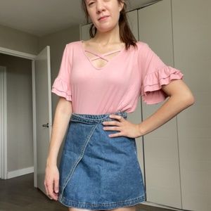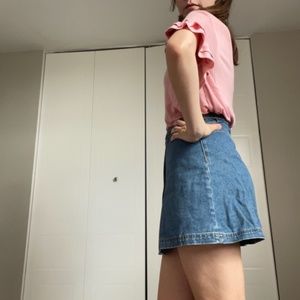 Cute wrap denim mini skirt- secures with a buckle and a clear button on the inside.