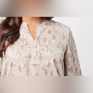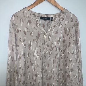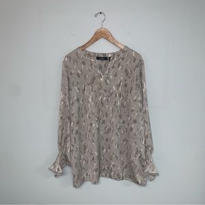 Dennis Basso Blouse Size Large Beige Tan Stretch Satin Smocked Cuff Tunic