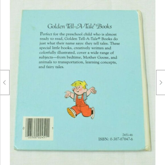 Vintage Dennis the Menace: Takes the Cake hardcover Golden Tell-a-Tale book from 1987. Good used condition; Scratch on front cover, minor wear to cover edges. Some color transfer/streaking on interior pages (see photos). 26 pages, hardcover, 6 1/4"x5 1/2".