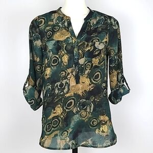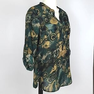 Excellent pre-owned condition, Denver Hayes blouse with abstract floral green and tan floral print, long and roll-up sleeves, lightweight, flowy and semi sheer, size small.