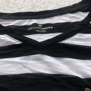 Denver Hayes 2xl summery striped top. New or line new top. Summery like blue and white striped , short sleeved top for those perfect summer days. Great for that boat cruises, strolls along the beach or staying cool in summer. March up with white shorts, capris, pants and or white sandals. Let’s get packing.