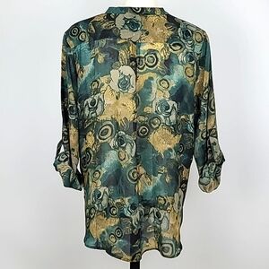 Denver Hayes Abstract Green Tan Floral Print Lightweight Semi Sheer Blouse Sz XL