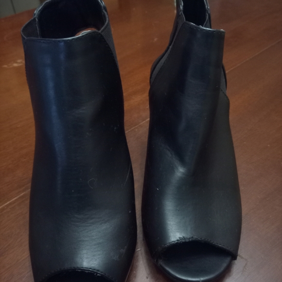 Chic black peep-toe booties. Sleek design for versatile wear.