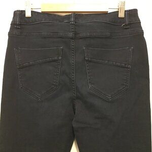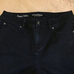 Very good preowned condition, dark blue, stretchy, high rise, curve-tech 'Hanna' jeans by Denver Hayes. Super cute tie-ups at the ankles.