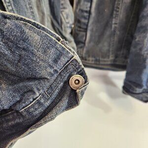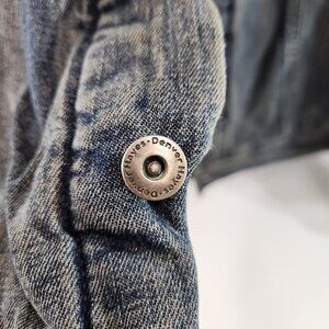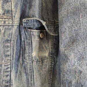 Denver Hayes quilted, warm denim jacket. Marked size 4XL but doesn't seem quite that big, as the pit to pit measurement is about 26". More like an XL. Distressed and worn in, it is missing the button on the right sleeve. It has some other wear and tear as shown in pictures. Has a military parachutists patch on the chest. Very heavy. Great work jacket for being outdoors in the cold, with an awesome look too.