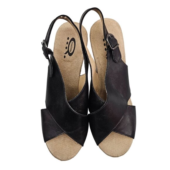 Denver Hayes Quad Comfort Women's Black Leather Cork Wedge Sandals Adjustable