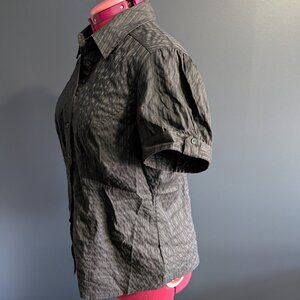Denver Hayes black button down short-sleeved shirt. Slightly shiny thread detail throughout and slight puff to sleeves. Very lightly worn.