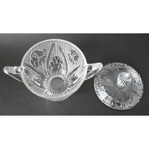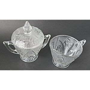 Depression Glass Iris And Herringbone Cream and Sugar with Lid Jeanette 1930's