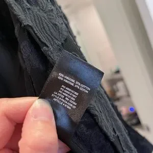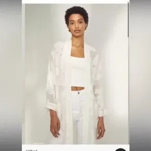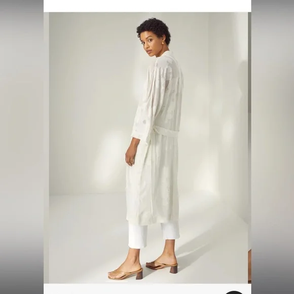 This is a long, open-front jacket with a self-tie belt and patch pockets. It’s made with hand-clipped, semi-sheer jacquard with intricate floral detailing.