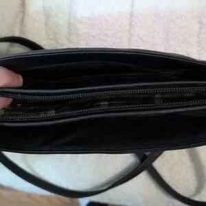 Main purse body zippers shut and has 1 internal zipper pocket, also has 2 outside zipper pockets