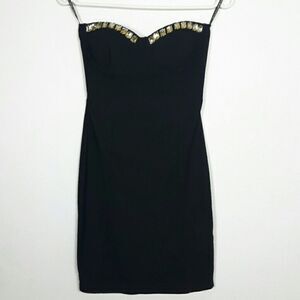 Make a statement in this stunning little black dress by Derek Heart Couture. Featuring a fitted ribbed texture and strapless sweetheart neckline, this LBD is sure to turn heads. The rhinestone accents on the cups add a touch of glamour and sparkle to this sexy bustier dress. Perfect for a night out on the town, a special occasion or even a date night, this dress is a must-have in any fashionista's wardrobe. New with tags and available in size Small.