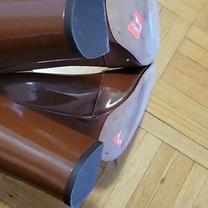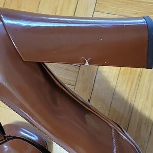 Step into sophisticated style with the DEREK LAM FW15 ACC Shoe in size 9. These pumps in a rich cocoa color are crafted from elegant patent leather, offering both timeless charm and a touch of luxury. The ankle strap design adds an element of chic flair to your outfit. Please note that there is a minor ripped part on the right pair, which is visible in the provided photos. Despite this, these shoes are in great condition overall and are proudly made in Italy.