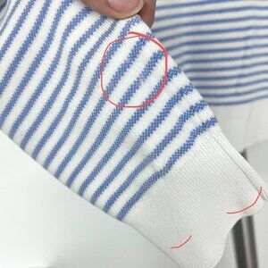 Light color discoloration on the sleeve. Small light marks along the bottom hem. (See last 2 photos) Good condition otherwise.