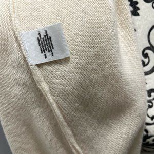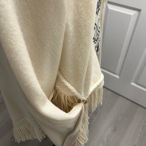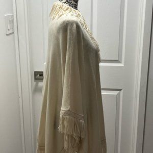 Beautiful, soft creamy beige 70% mercerized wool, 30% cashmere cape, with buttons for arm options and tassels at the neck, sleeve and hem. This is a one size fits all item, but at the middle of the back it measures 32" to the hem. Warm, but quite lightweight; dependent on style and season, can be worn alone or over a coat for added appeal. Thanks for stopping by - any questions, just ask!