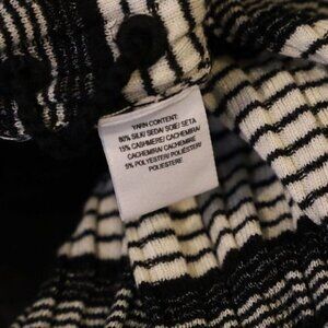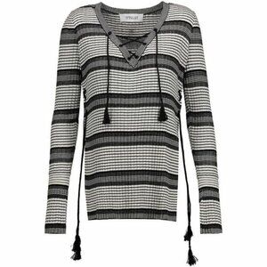 Braided ties detail the lace-up neckline and sides in this Derek Lam 10 Crosby Sweater. Flared long sleeve cuffs, with high slits at side of hem. In black/white striped knit. Made from a luxurious silk/cashmere fabric.