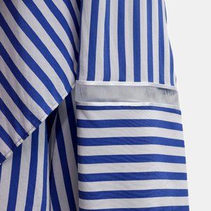 A luxurious long-sleeve silk blouse from Derek Lam 10 Crosby circa 2017 featuring white and blue stripes constructed to a relaxed boxy fit with a v-neckline, wide half sleeves with sheer bands, and a diagonal outer self layer contrasting with the vertical striped pattern and creating a handkerchief hem.